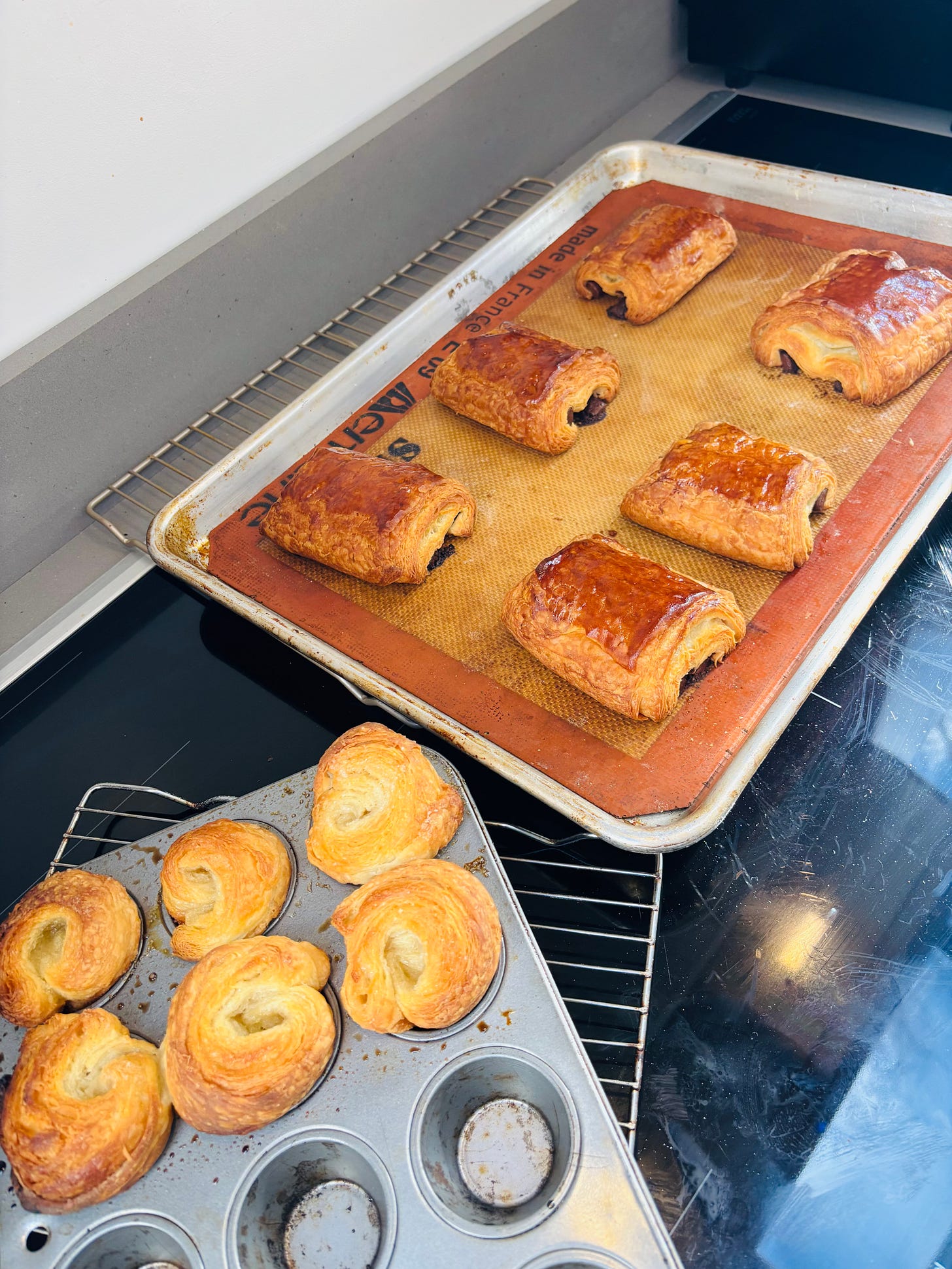 Laminated pastry is a thing that I’d like to be brilliantly talented at at but am not yet, and Thanksgiving will provide another opportunity but for now I am working on a yeasted one for croissants and pain au chocolat and I’ll be damned if I can figure out how to roll up a p.a.c. such that it does not unroll in the oven like these.