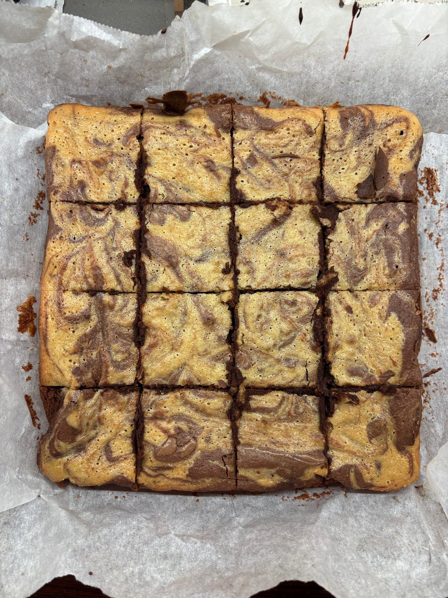 I don’t think my mother would particularly care if I don’t add the walnuts although I’d certainly hear about it. You know what else I’d hear about? That “the apple doesn’t fall far from the tree” because Izzy made these tahini brownies and obviously she is a brilliantly talented baker because all of my mother’s grandchildren are brilliantly talented at whatever they choose to do.