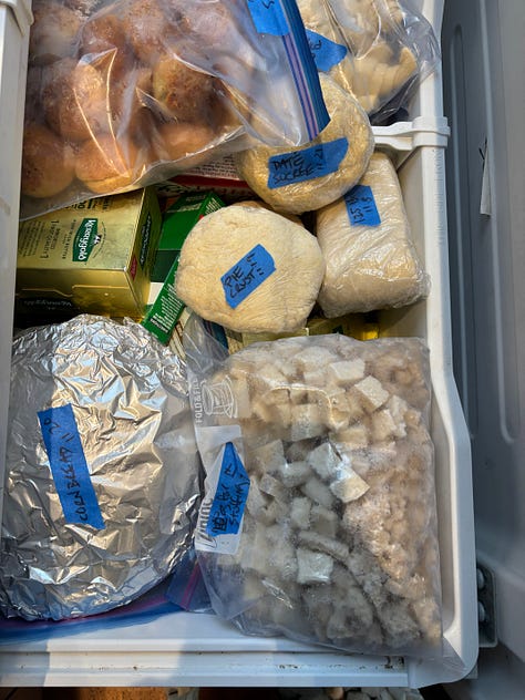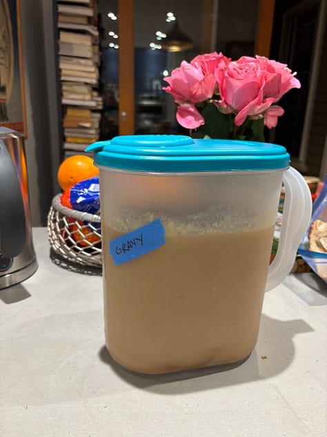 Dressing, well, that remains a work in progress as I’ve yet to really settle on a perfect one. This year’s was fine but too poultry-seasoning forward and that didn’t go so well cold. It needed gravy the next day which was good because there was so. much. gravy. Pro tip: don’t make three quarts next year despite the interwebs’ exhortations that you cannot have too much gravy because you know what? You can, and if you do, you end up feeding last year’s frozen gravy that you found in the depths of the freezer to the dog as his Thanksgiving treat. But do make more cran sauce than you think you need because a turkey and mayo sando the next day is just not the same without it.