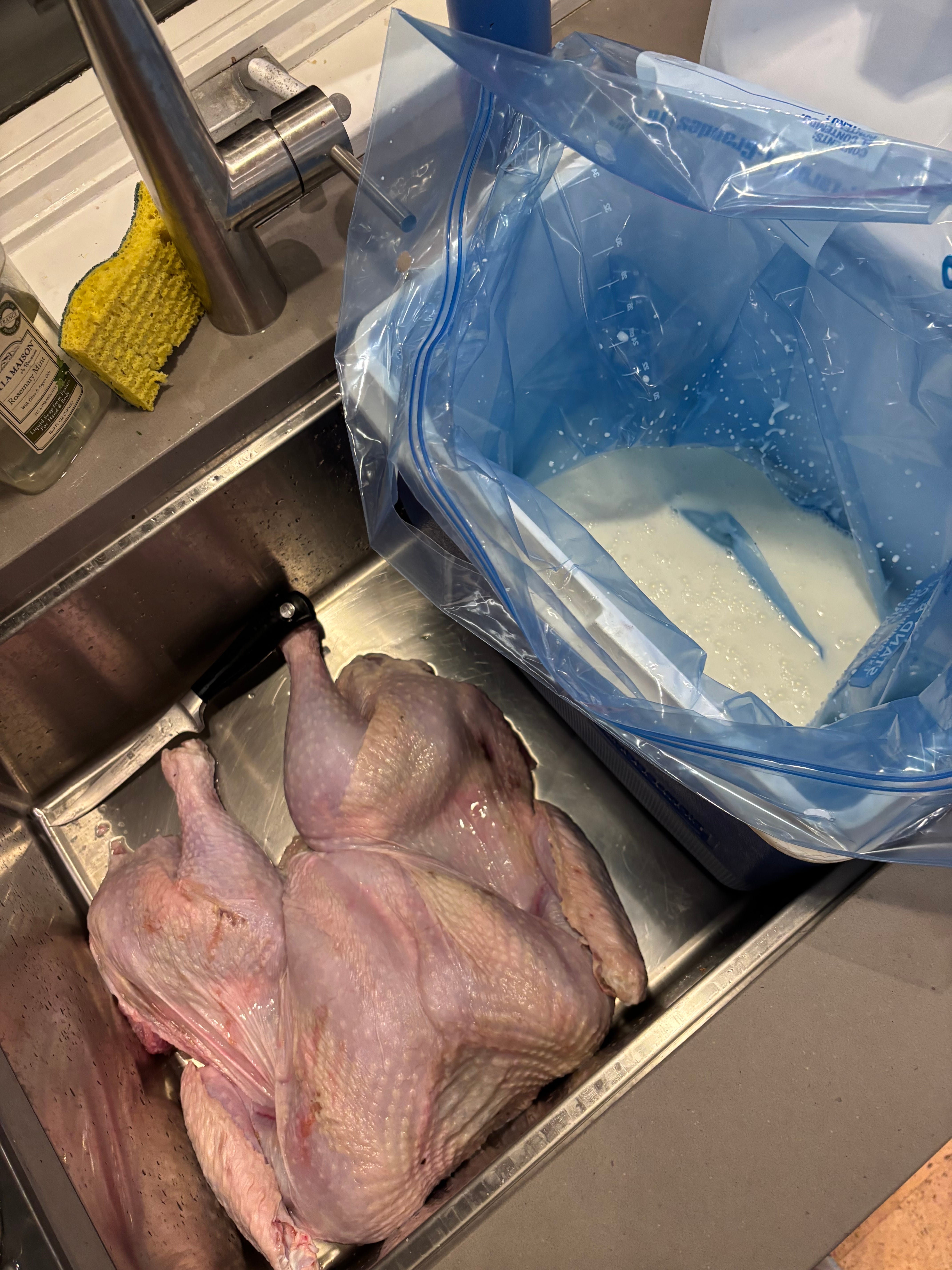 Samin Nosrat’s buttermilk-brined turkey - last year’s notes said dry, trust the thermometer so this year I trusted the thermometer. Also, this is why you got a giant sink so you can spatchcock your turkey in it, and then get the cooler in there in order to fill your garment bag with all the buttermilk.